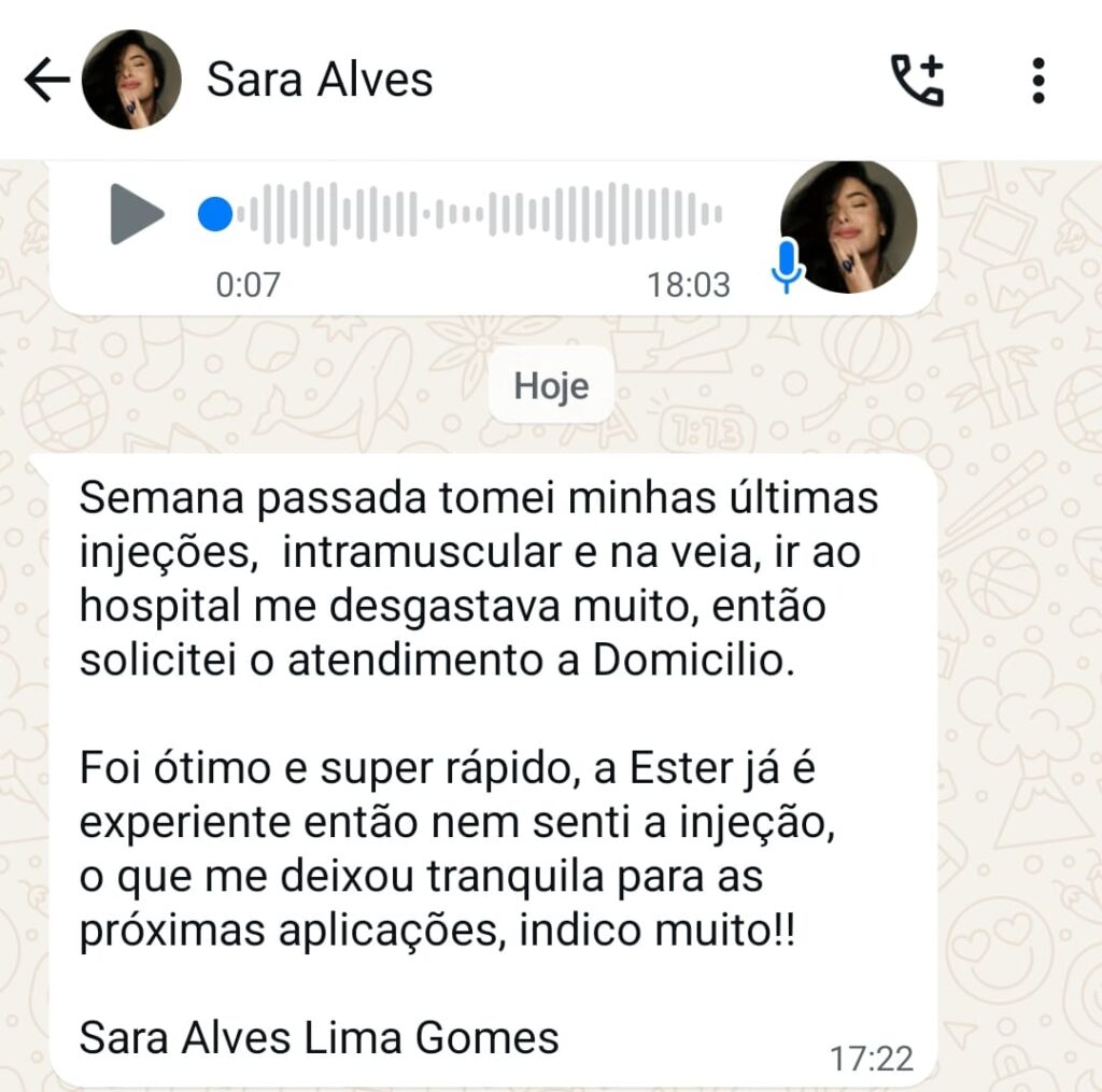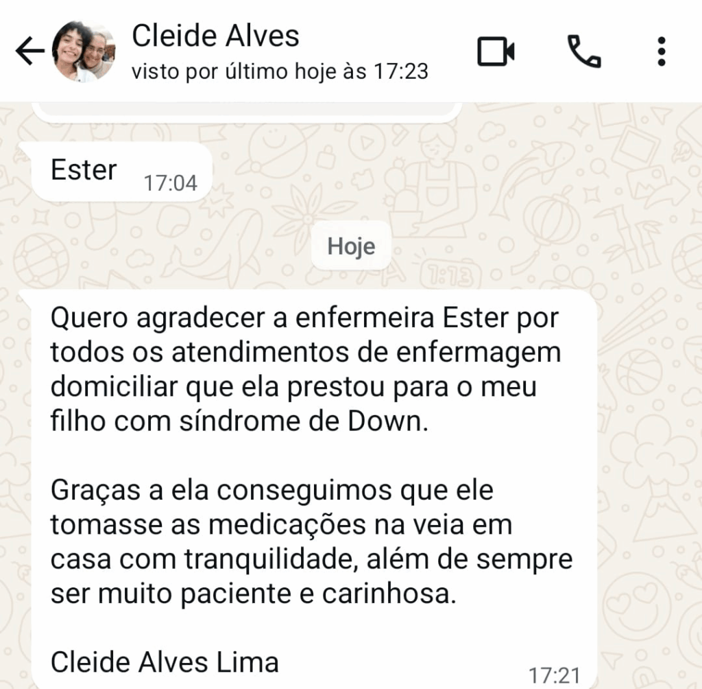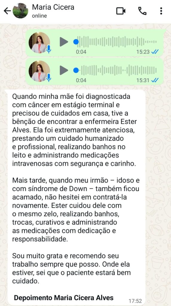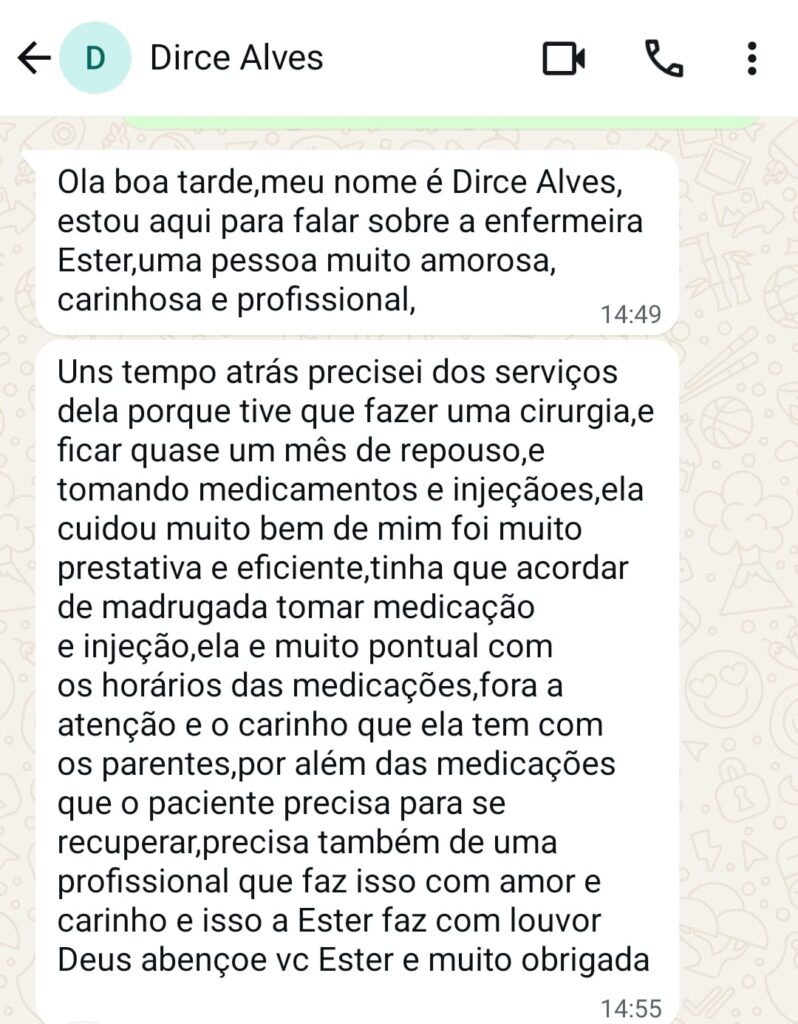 Olá, sou Ester Alves, enfermeira com sólida experiência em atendimentos domiciliares humanizados e de alto padrão.