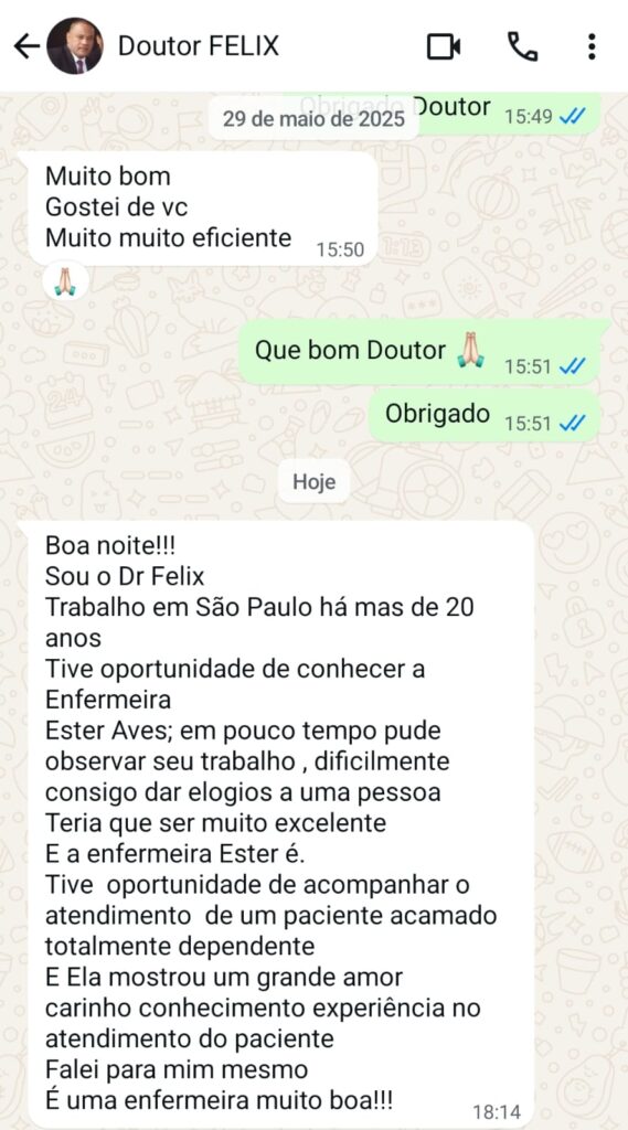 Com sólida experiência na assistência individualizada, minha missão é oferecer cuidados com excelência, empatia e discrição, respeitando as particularidades de cada paciente e de sua família.