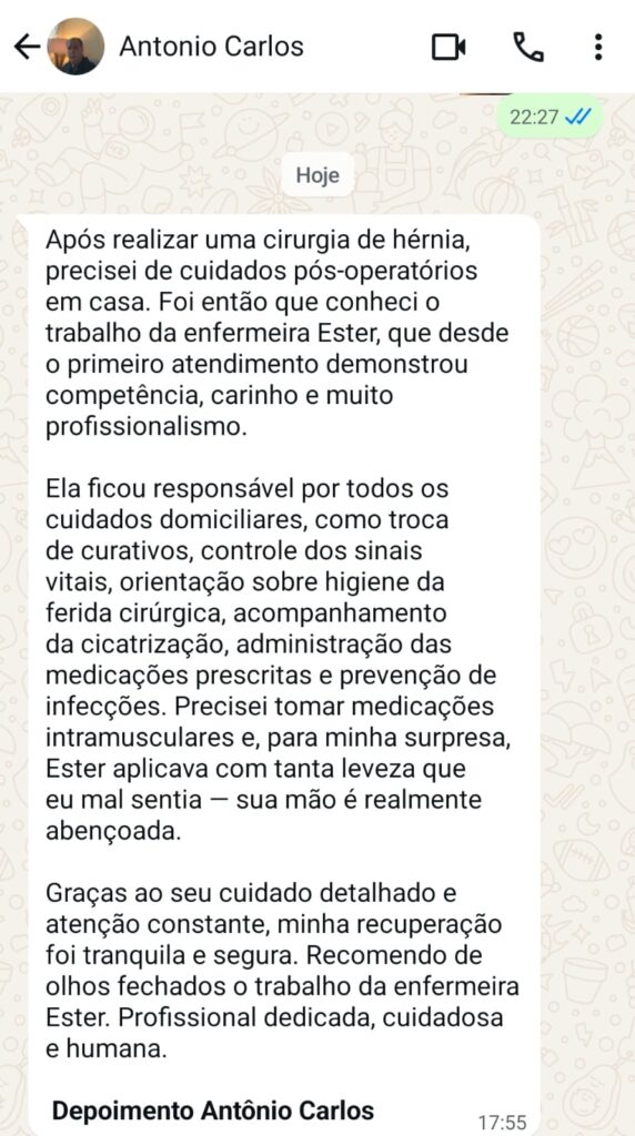 Acredito que saúde vai muito além da ausência de sintomas: é acolhimento, escuta ativa e presença qualificada. Por isso, escolhi estar onde o cuidado mais importa — dentro do lar, promovendo conforto, segurança e tranquilidade.